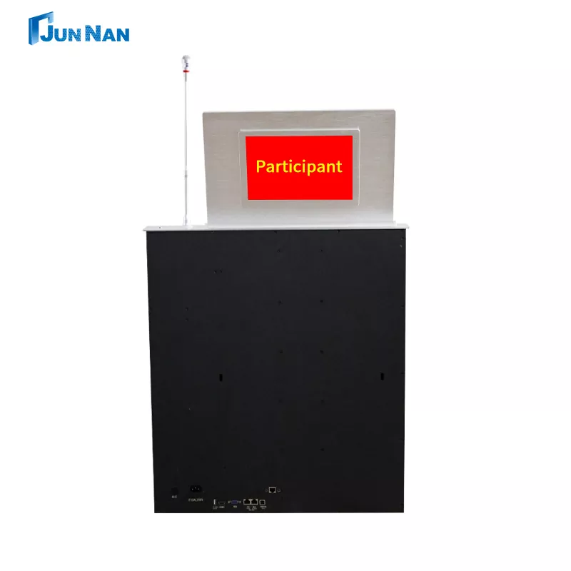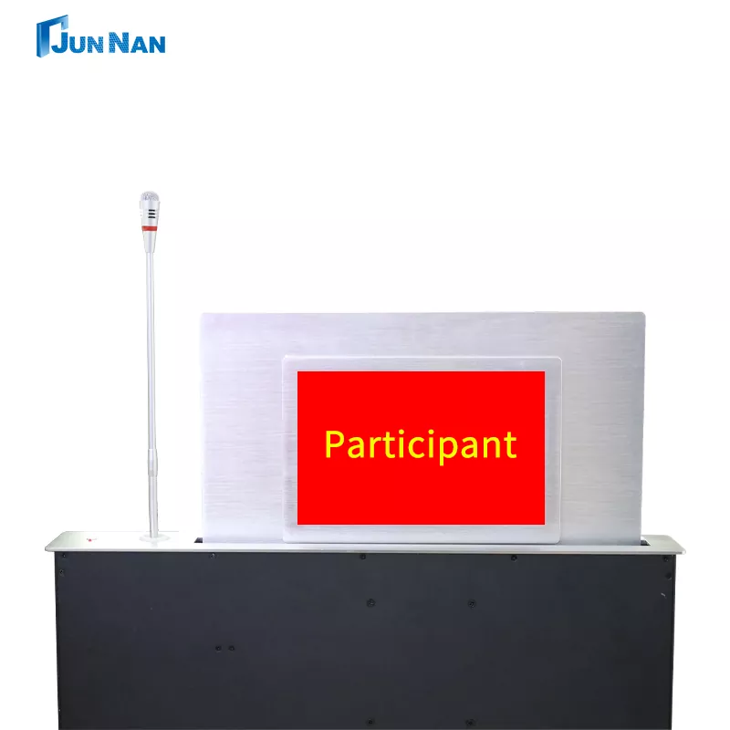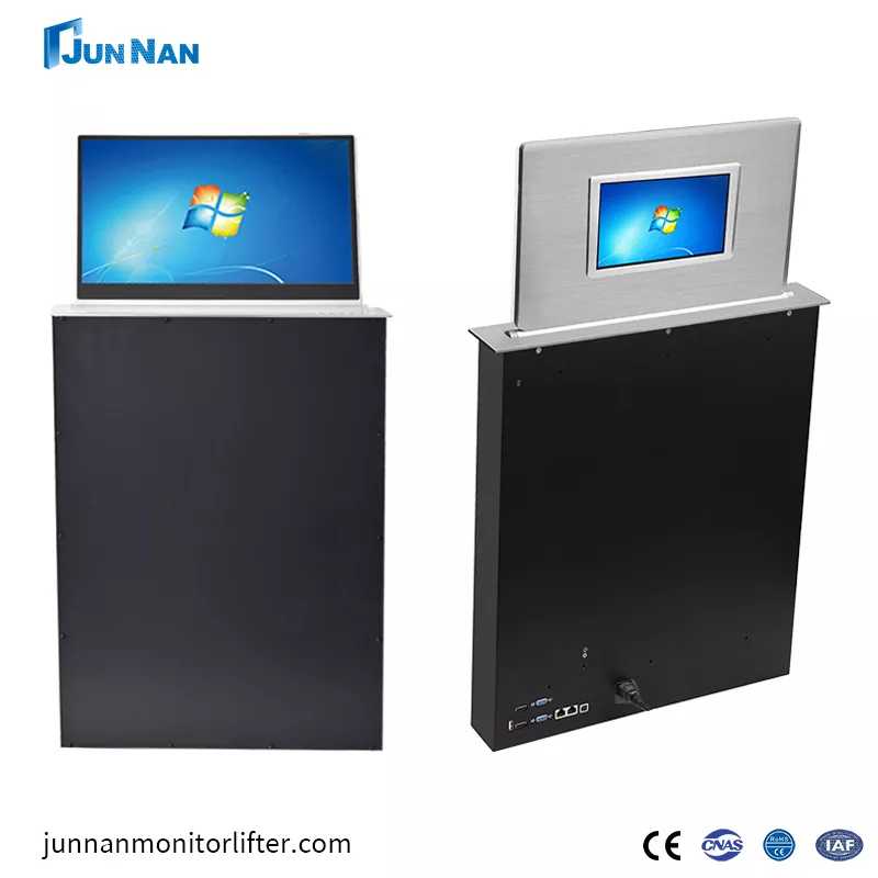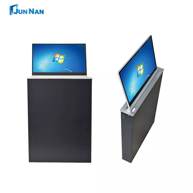 후면 스크린 LCD 모니터가 장착된 고급 회의용 전동식 터치스크린 LCD 모니터 리프트는 다양한 시나리오에 적합합니다. 당사는 CNC 기계 절단 기술과 레이저 기술을 보유하고 있으며 최신 LCD 모니터 리프팅 스테이션 기술을 통해 제품의 우수한 표준을 보장합니다. 우리의 모든 LCD 모니터 리프팅 스테이션은 중국 제조에 속하며 도매 구매가 가능하고 고객을 위해 개인적으로 맞춤화할 수 있으며 고객에게 빠른 배송을 지원하기에 충분한 LCD 모니터 리프팅 스테이션 재고를 보유하고 있습니다. 후면 스크린 또는 후면 테이블 플레이트가 있는 LCD 모니터 리프팅 스테이션은 특별히 설계된 리프팅 장비로 회의 시스템, 특히 회의 내용과 참가자 정보를 표시해야 하는 경우에 주로 사용됩니다. 그리고 우리 Junnan Equipment는 CCC, CE 인증, ROHS, ISO 인증 등과 같은 다양한 인증서 및 인증을 보유하고 있습니다. 당사의 제품은 수출 자격을 갖춘 안전하고 고품질이며 유리한 가격으로 공장 직매하고 있습니다. 그리고 우리는 수년 동안 사업을 이어온 자체 공장을 가지고 있습니다.