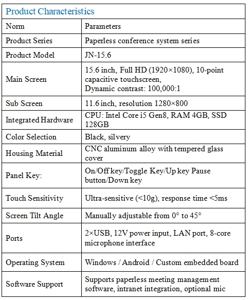 15.6 인치 메인 터치 스크린과 11.6 인치 뒷면 화면이있는이 데스크탑 터미널은 회의 효율성, 보안 및 상호 작용을 향상 시키도록 설계된 포괄적 인 종이없는 컨퍼런스 시스템의 일부입니다.